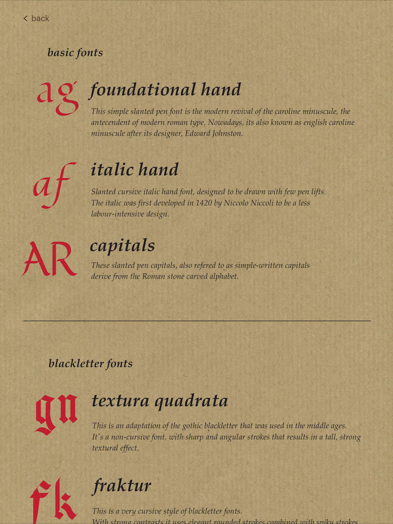 Calligraphy Practice is an iPad App that teaches you to draw beautiful calligraphy. It features specially designed fonts with tracing steps and a custom multi-touch drawing system that uses two fingers to emulate a calligraphy parallel pen.